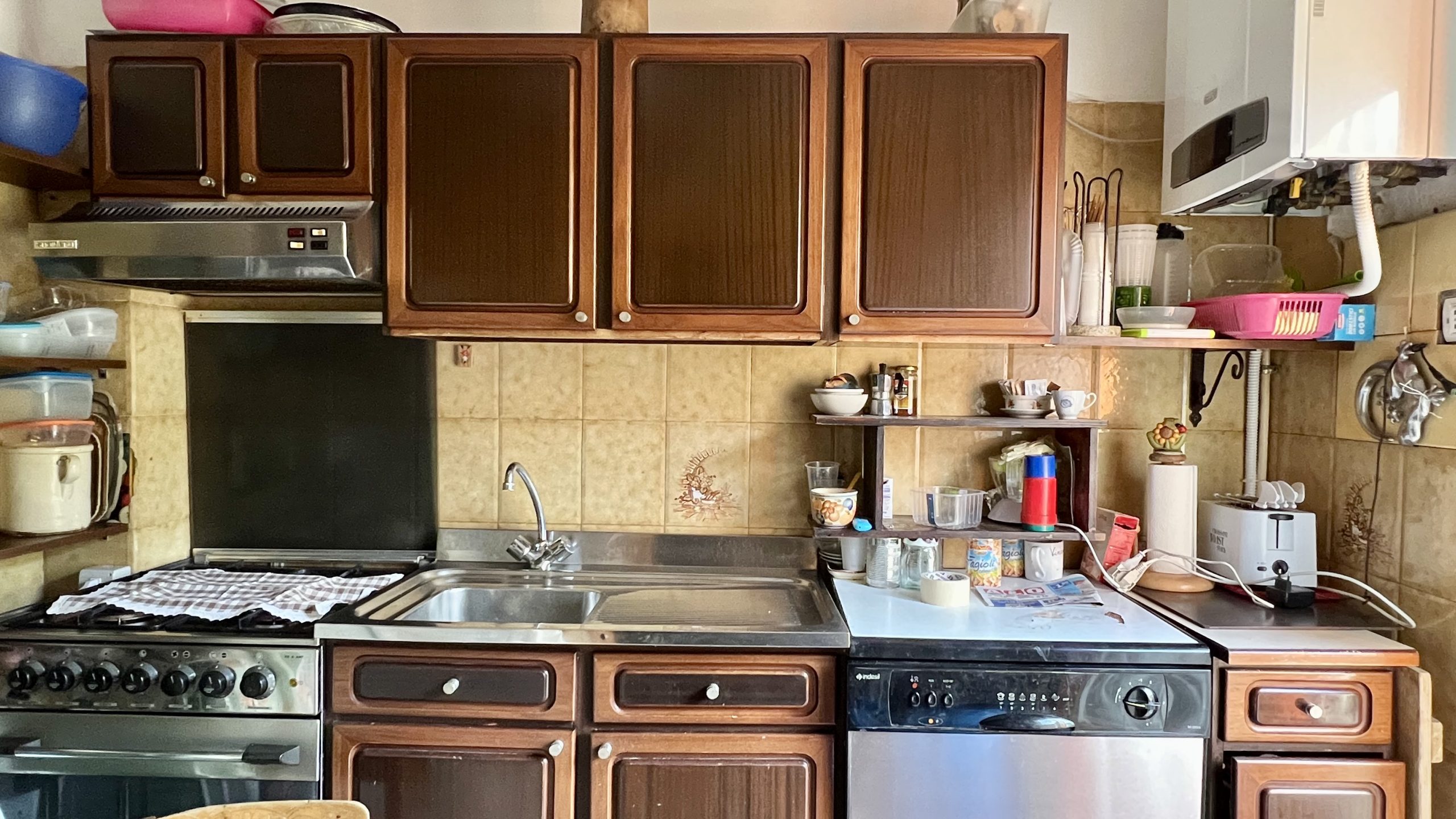 Cucina con rivestimenti in piastrelle e spazio attrezzabile per le necessità quotidiane.