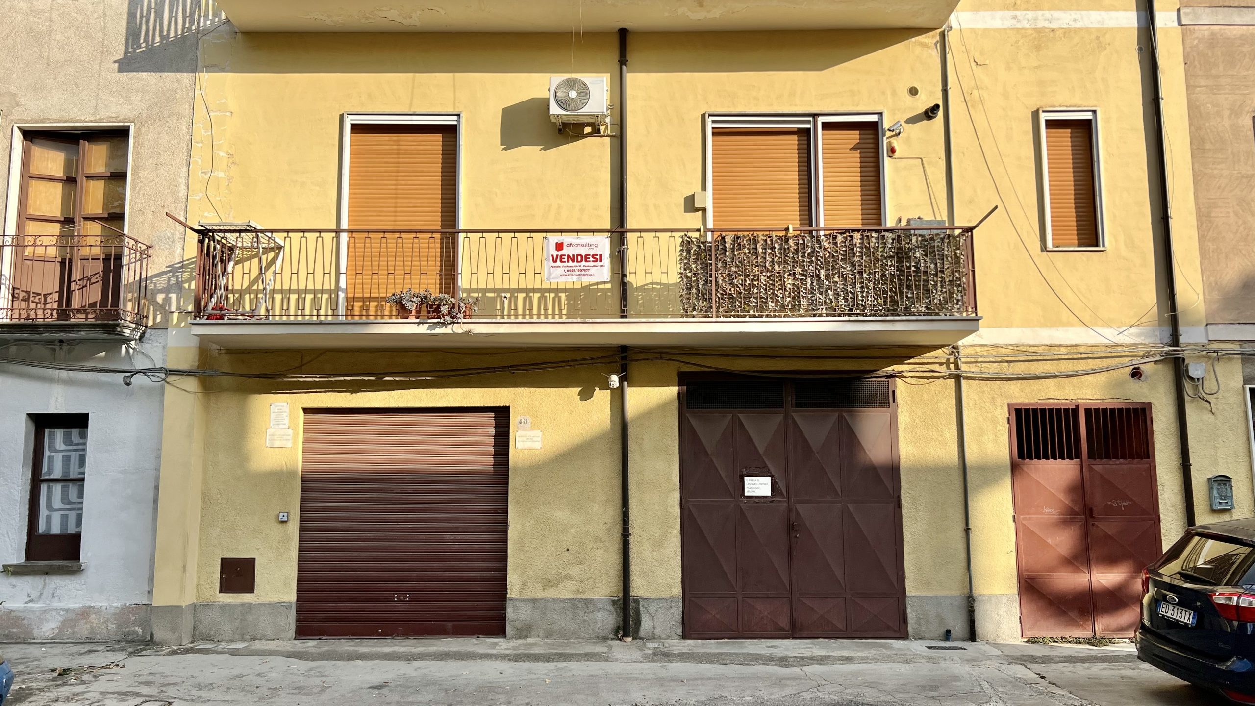 L’esterno del fabbricato presenta un balcone al piano e locali/garage al piano terra.