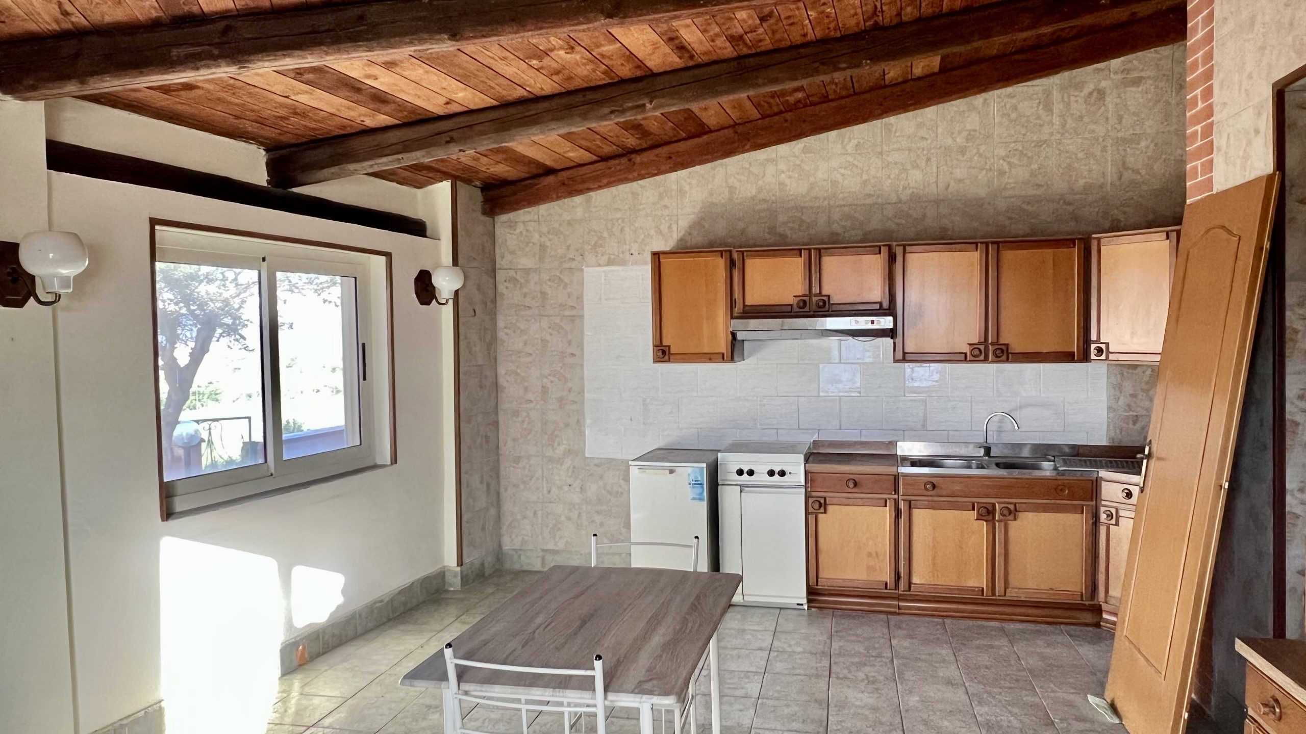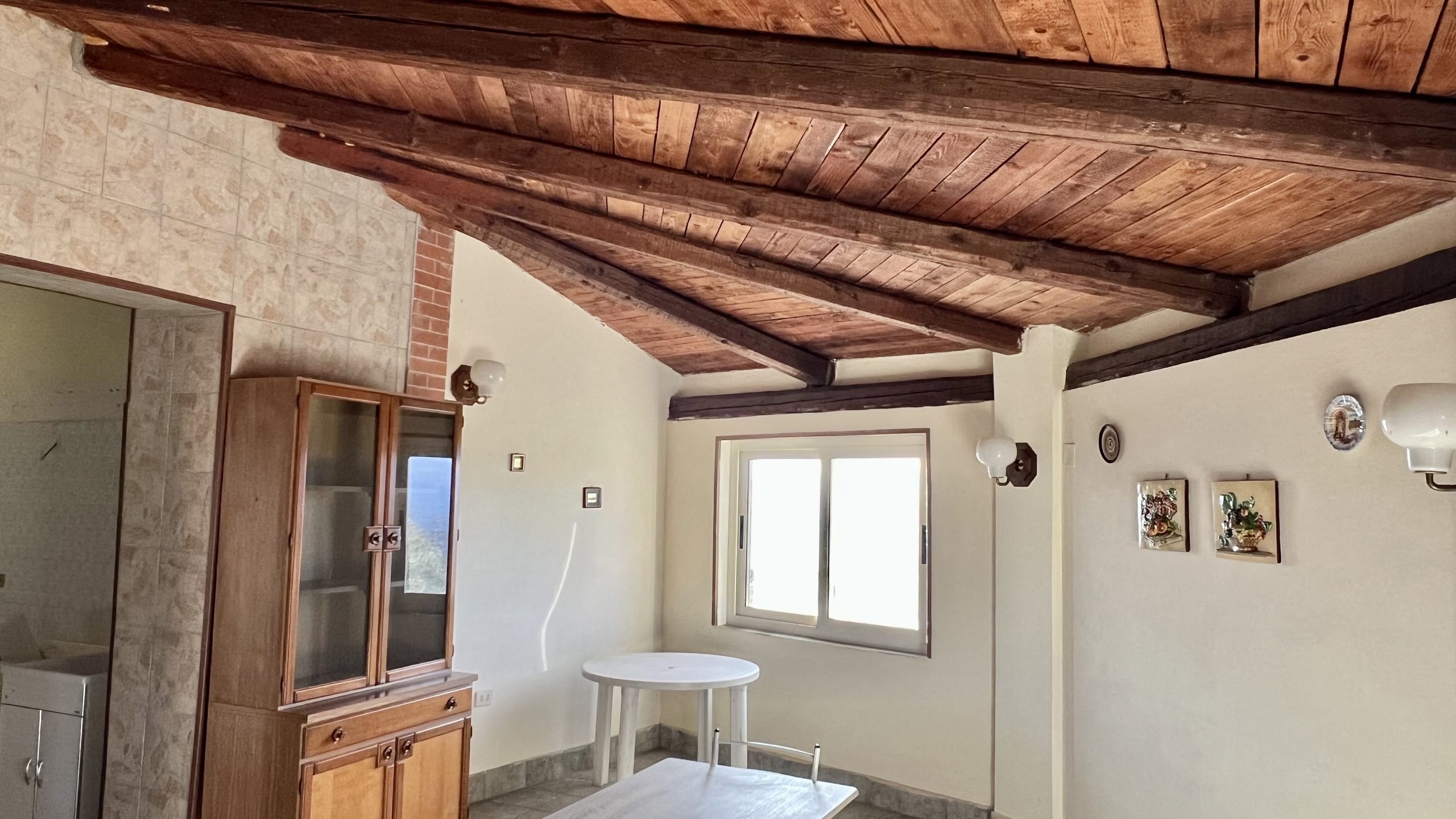 Cucina: Abitabile e spaziosa, con soffitto in legno a vista e accesso diretto agli spazi esterni.